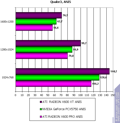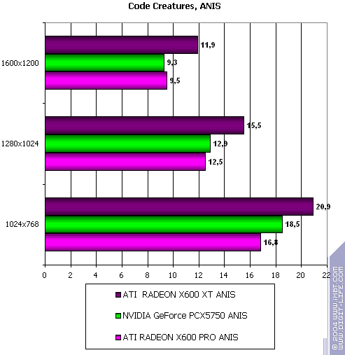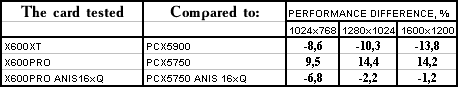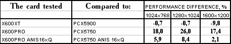 Я не буду комментировать каждый тест, думаю, что читатели сам по таблицам с процентами все поймут :). Замечу лишь, что X600XT/PRO тестировались как в обычном режиме, так и с включенной анизотропией, а X300SE по причине маломощности — только в обычном режиме, и к сожалению, она пока не имеет конкурента себе среди аналогов от NVIDIA.