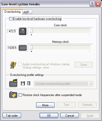 Причем, APE саму себя прописывает в реестр, и загружается как процесс, поэтому пользователь ее присутствия вообще не видит (она нигде не пишет о том, что загружена). Вероятно это сделано потому, что ATI запрещает любые изменения частот через BIOS, и действительно, карта без APE работает на штатных для X800 PRO 475/900 MHz. Замечу, что утилита поставляется вместе с картой, а обновления можно будет скачать с сайта компании.