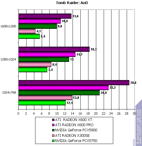 - Tomb Raider: Angel of Darkness v.49 (Core Design/Eldos Software) — DirectX 9.0, Paris5_4 demo, настройки тестирования приведены здесь.