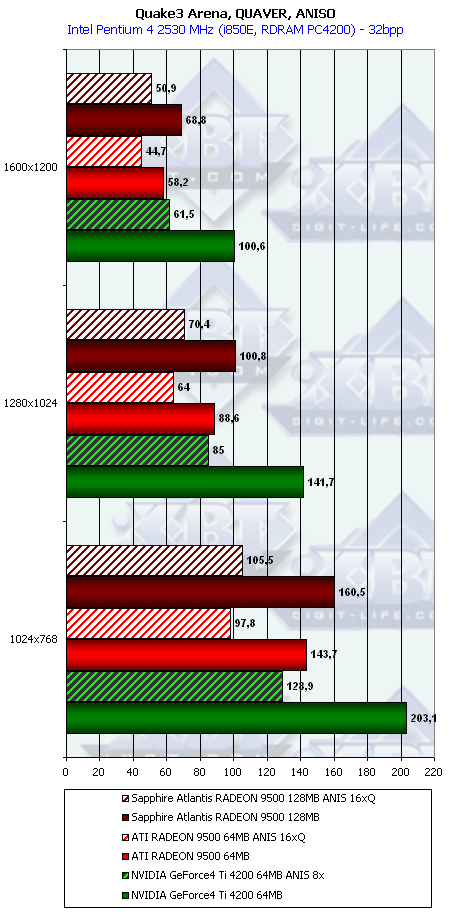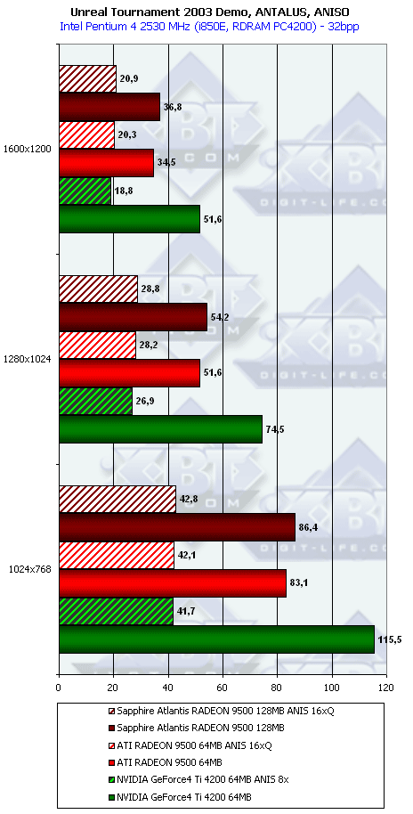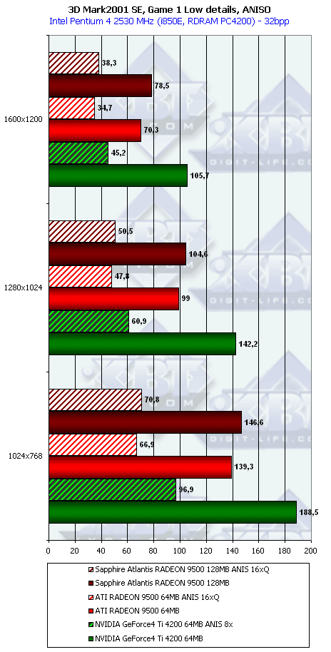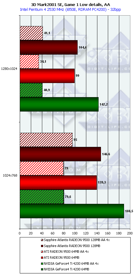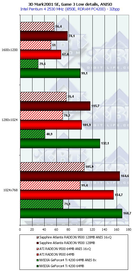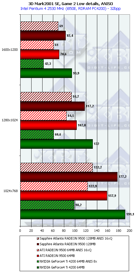 В самом конце этого списка есть наш обзор RADEON 9500, где мы познакомились с этим продуктом и выяснили, что по производительности он не так уж и хорош для своей цены в $140-150. И сделали вывод, что проигрыш карте на базе Ti 4200 во многих случаях нивелирует все плюсы поддержки DX9. А кроме того, кое-где RADEON 9500 проиграл конкуренту и в режимах с АА и анизотропией. И поэтому красная цена такой карте — не выше $120.
