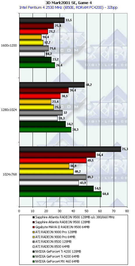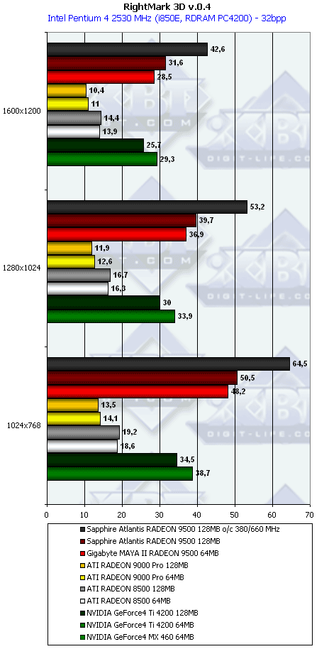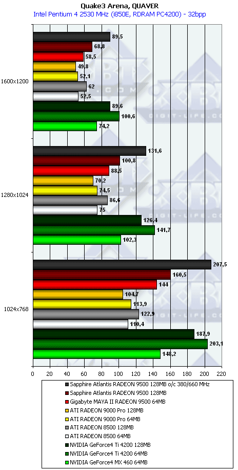 - Самый главный вывод: RADEON 9500 128MB весьма прилично быстрее своего 64-мегабайтного аналога, здеусь уже можно говорить о том, что он — прямой конкурент GeForce4 Ti 4200 по скорости, а в тяжелых режимах даже быстрее, несмотря на урезанность графического процессора. И не надо забывать о поддержке DirectX 9.0, чего нет у Ti 4200.