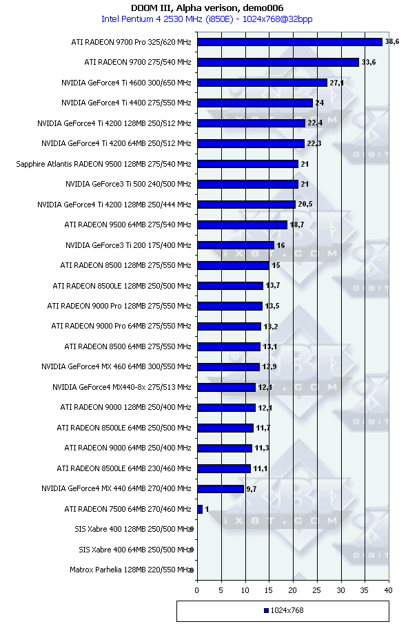Мы решили протестировать массу видеокарт в альфа-версии будущего хита DOOM III, не так давно "утекшей в Сеть". Хотя в комплекте с этой полу-игрой есть своя демо, мы решили воспользоваться любезно предоставленными сотрудниками информационного ресурса 3DNews.ru двумя демо. Это demo002 и demo006. За подробностями относительно того, как и где их взять — просим обращаться на сайт 3DNews, где есть обзор DOOM III v.0.02, в котором указанные demo принимали участие.