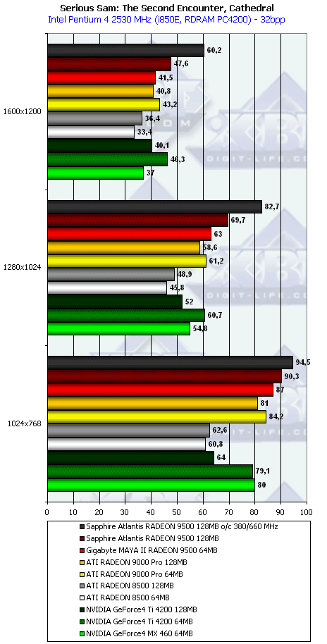 - Serious Sam: The Second Encounter v.1.05 (Croteam/GodGames) — OpenGL, мультитекстурирование, Grand Cathedral demo, настройки тестирования: quality, S3TC OFF
