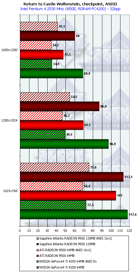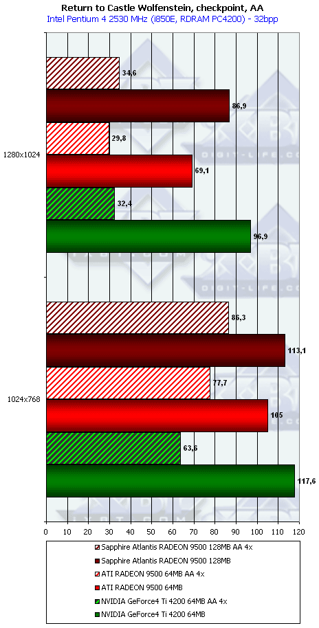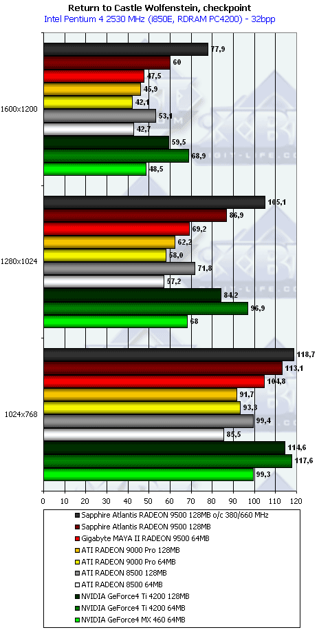 - Return to Castle Wolfenstein (MultiPlayer) (id Software/Activision) — OpenGL, мультитекстурирование, Checkpoint-demo, настройки тестирования — все на максимально возможном уровне, S3TC OFF, конфигурации можно скачать тут