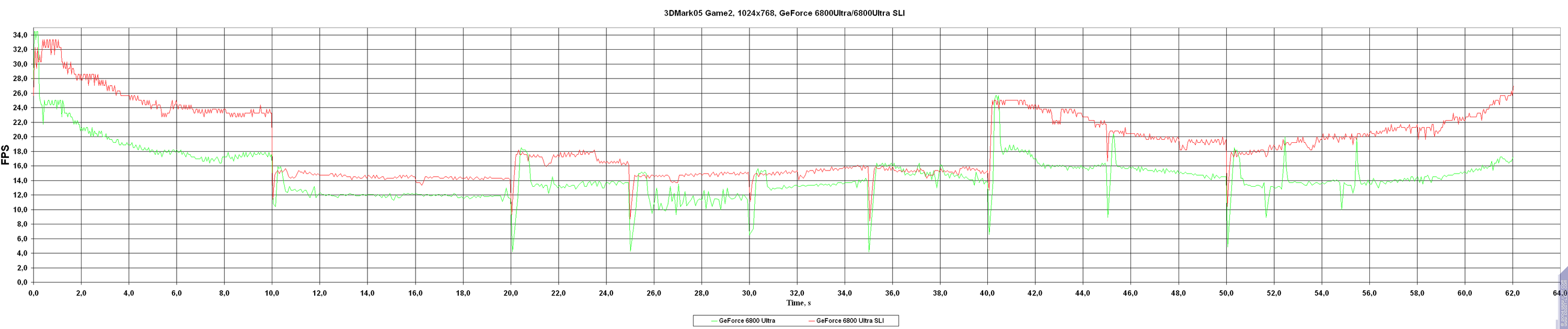 - 6800Ultra SLI — против 6800Ultra — тест явно уперся в системные ресурсы, поэтому приросты по скорости весьма скромные.