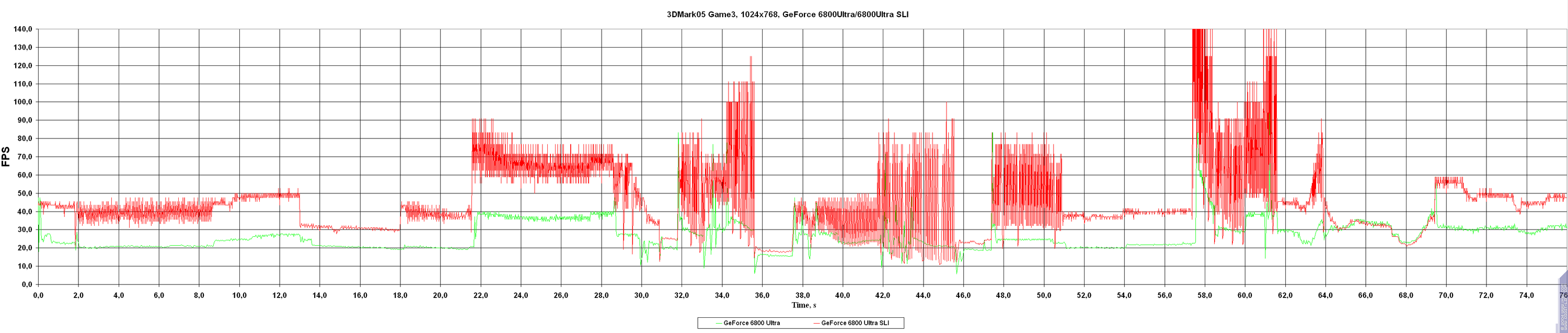 - Результаты тестов: 3DMark05 Game3 (с графиком FPS по времени)