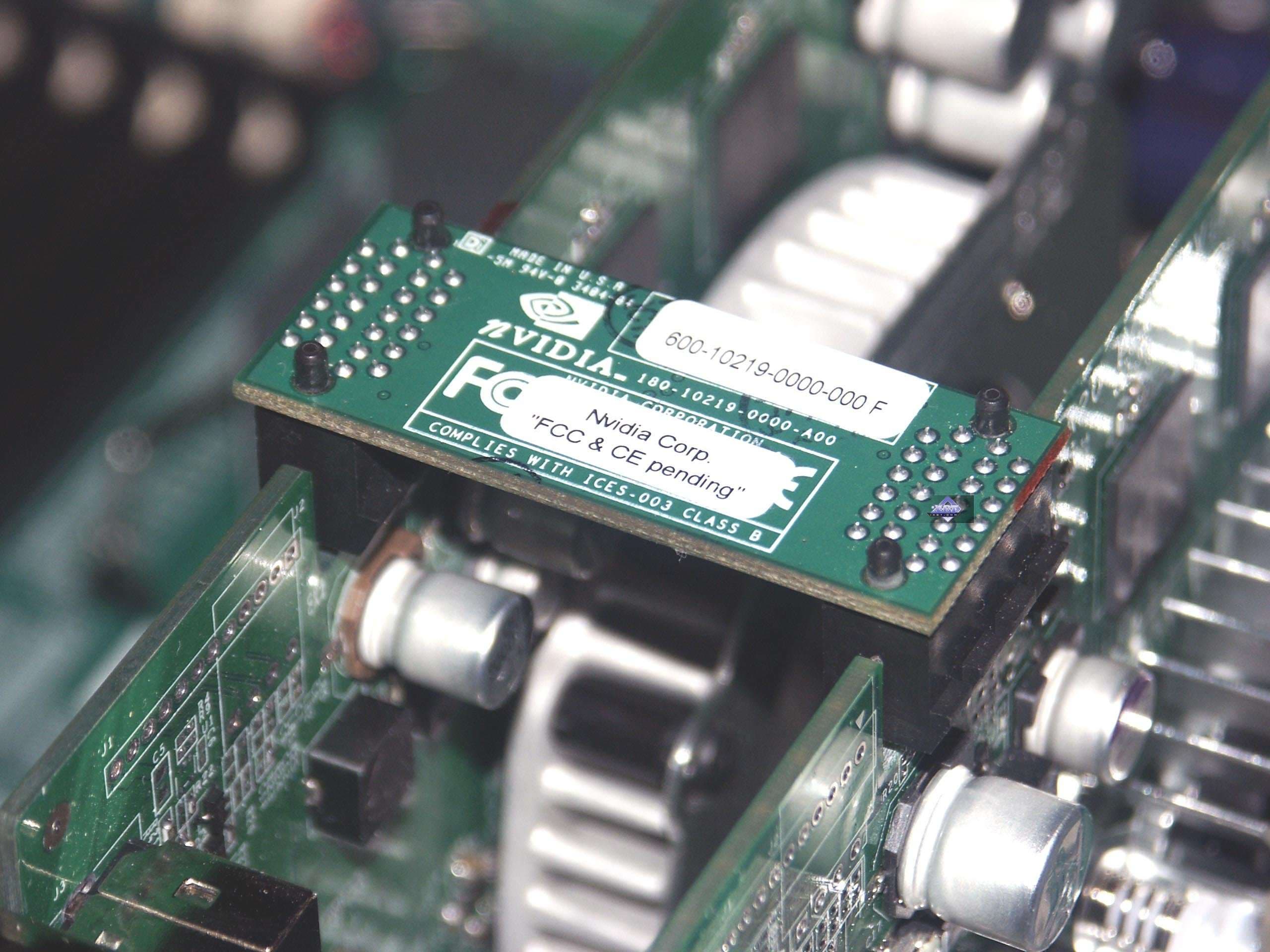 Заметим, что внутри соответствующих чипов (NV45, NV43) имеется специальный блок, отвечающий за SLI, он работает с общими ресурсами для двух плат. Обмен данными производится по шине, а синхронизация — через специальный переходник-коммутатор, одеваемый на обе карты (см. на снимках ниже).