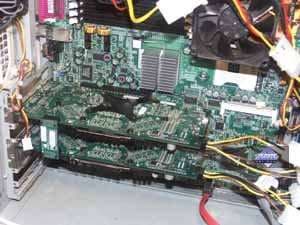 Примечание: прошу не удивляться, что на снимках видны разные вентиляторы на CPU. Штатный вентилятор был такой шумный, что даже голова начала болеть (сильный свист на высоких частотах), поэтому пришлось его снять и временно установить обычный вентилятор от БП, который успешно обдувал медный радиатор без всякого шума, при этом последний был почти холодным (зачем ставить 7000-оборотный и очень шумный вентилятор на такой радиатор?).