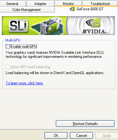 Должен отметить, что главным условием работы SLI на сегодня является полная ИДЕНТИЧНОСТЬ видеокарт, входящих в пару SLI. Я провел эксперименты с несколькими GeForce 6600GT от разных производителей, и скажу, что только видеокарты от Leadtek и Palit смогли работать вместе, драйвер их связку определял корректно, и SLI организовывал. В остальных случаях драйвер извещал, что одна из двух карт не совместима со SLI. Тасовались между собой видеокарты производства кроме вышеупомянутых фирм, еще Gainward, Gigabyte.