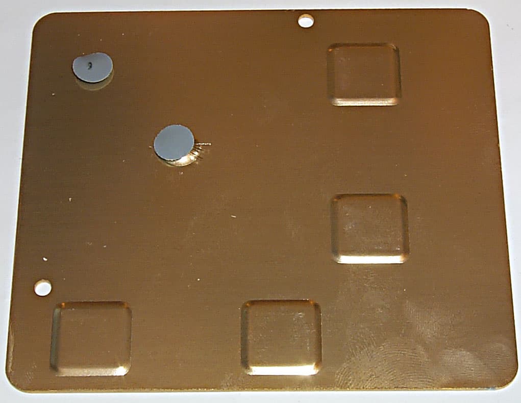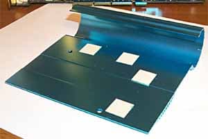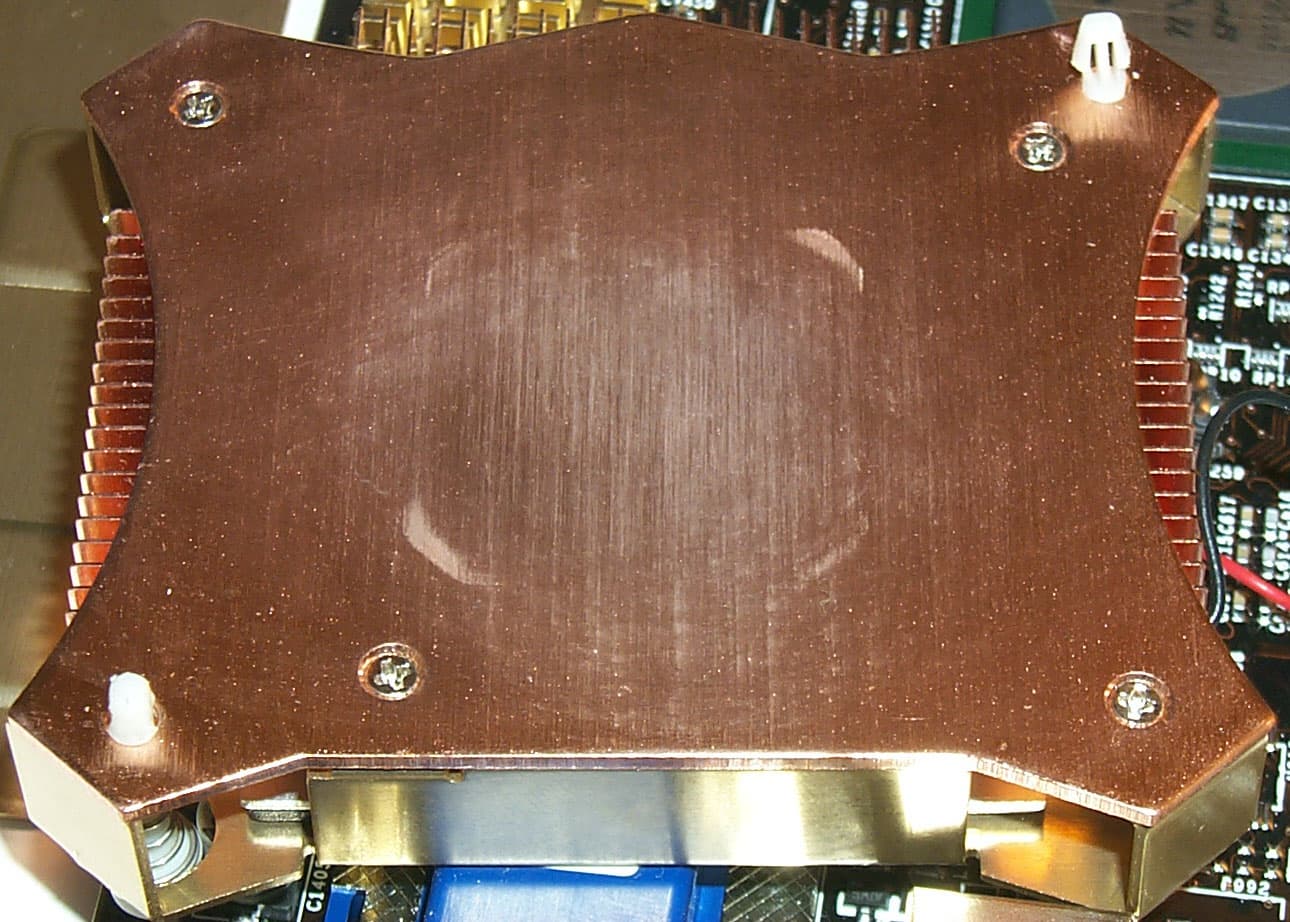 Мы видим, что большой радиатор имеет медное основание, причем тщательно отполированное. А второй радиатор представляет собой пластину, призванную охлаждать микросхемы памяти на обороте карты, однако это получается не так хорошо, как хотелось бы: