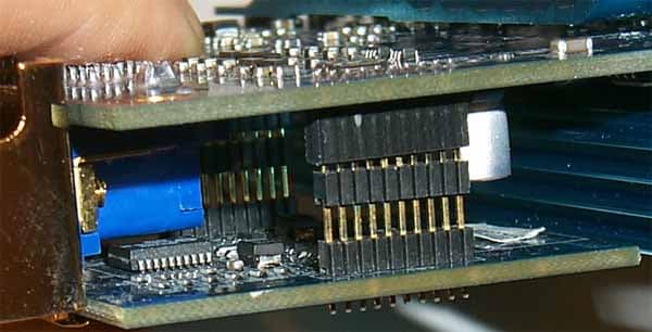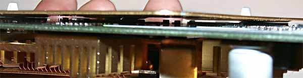 Мы видим, что пластина закреплена только в двух местах, и один из углов явно "оттопырывается", что приводит к плохому контакту с одной из микросхем памяти. К тому же, в ASUS явно поскупились на термопасту, и пластина просто "лежала" на микросхемах, только ухудшая перегрев. Поэтому советуем разработчикам пересмотреть концепцию охлаждения оборотной стороны этой карты.