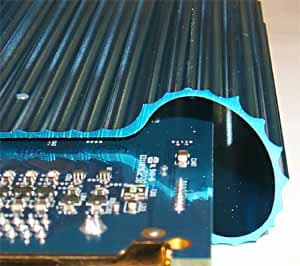 Несмотря на то, что у этих радиаторов есть термопроводящие прокладки, которые способствуют более тщательному контакту с микросхемами, все же конструкция охлаждения из раздельных радиаторов для микросхем памяти и ядра надежнее и эффективнее. Как еще один плюс можно отметить форму "заворота" большого радиатора над картой в виде цилиндра с большим отверстием. Если установить около торца карты дополнительный вентилятор, который дул бы вдоль платы, то воздух проходил бы как раз через это отверстие, охлаждая радиатор.