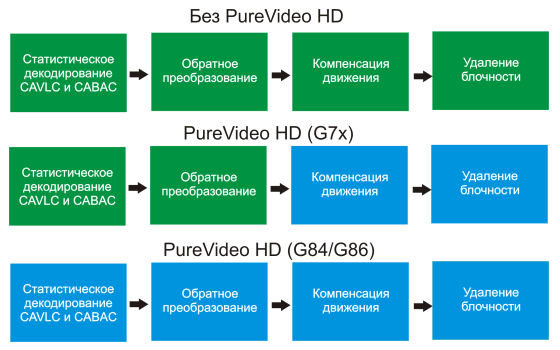 В G94 встроен всё тот же видеопроцессор второго поколения, известный по G84/G86 и G92, отличающийся улучшенной поддержкой PureVideo HD. Он почти полностью разгружает CPU при декодировании большинства распространенных типов видеоданных, в том числе H.264, VC-1 и MPEG-2, с разрешением до 1920x1080 и битрейтом до 30-40 Мбит/с, выполняя работу по декодированию полностью аппаратно. И хотя декодирование VC-1 у решений NVIDIA не такое эффективное, как H.264, небольшая часть процесса использует мощности центрального процессора, но это всё равно позволяет воспроизводить все существующие HD DVD и Blu-Ray диски даже на средних по мощности компьютерах. Подробнее о видеопроцессоре второго поколения можно прочитать в наших обзорах G84/G86 и G92, ссылки на которые приведены в начале статьи.