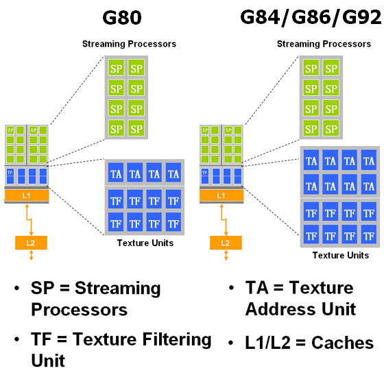 - 32 блока билинейной фильтрации (как и в G84 и G92, это даёт увеличенное количество билинейных выборок, но без бесплатной трилинейной фильтрации и эффективной анизотропной фильтрации)