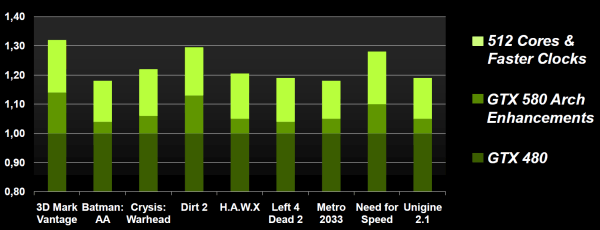 Среднее ускорение от роста частот с 783/1566 до 900/1800 МГц составляет ещё примерно столько же (около 13-14%), а в некоторых современных играх, таких как Just Cause 2 и Battlefield Bad Company 2, оно и вовсе равно теоретическому приросту в частотах. Ну а в среднем, по набору игровых тестов у NVIDIA для GeForce GTX 550 Ti получились приросты FPS порядка 28%.
