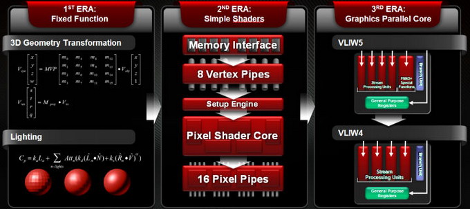 Чтобы оценить актуальность архитектурных модификаций в Southern Islands, сначала рассмотрим развитие GPU за прошедшие несколько лет в представлении AMD. До 2002 года графические чипы представляли собой специфичное аппаратное обеспечение, способное исключительно на графические вычисления. Видеочипы того времени имели ограниченную функциональность, они умели лишь накладывать и фильтровать текстуры, обрабатывать геометрию, заниматься примитивной растеризацией и поэтому совсем не подходили для универсальных вычислительных задач.