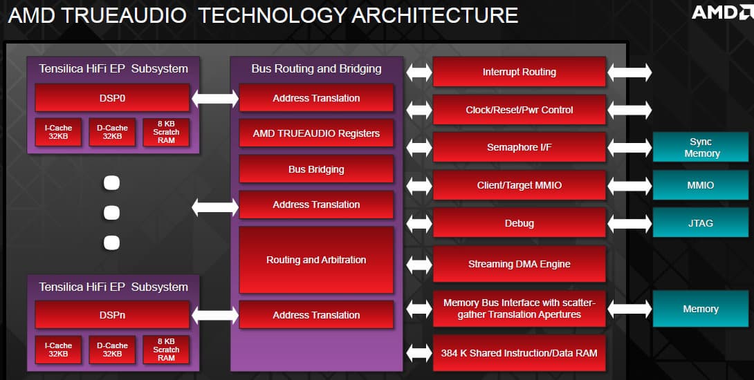TrueAudio — это встроенный программируемый аудиодвижок в GPU компании AMD, он обеспечивает гарантированную обработку звуковых задач в реальном времени вне зависимости от установленного центрального процессора. Для этого в названные графические процессоры AMD интегрировано несколько DSP-ядер Tensilica HiFi EP Audio DSP, доступ к их возможностям осуществляется при помощи популярных библиотек по обработке звука, разработчики которых могут использовать ресурсы встроенного аудиодвижка при помощи специального TrueAudio API. AMD уже давно и плотно сотрудничает со многими компаниями, известными по своим разработкам в этой сфере: игровыми разработчиками, разработчиками аудио-middleware, аудиоалгоритмов и др., и несколько игр с поддержкой TrueAudio уже вышли.