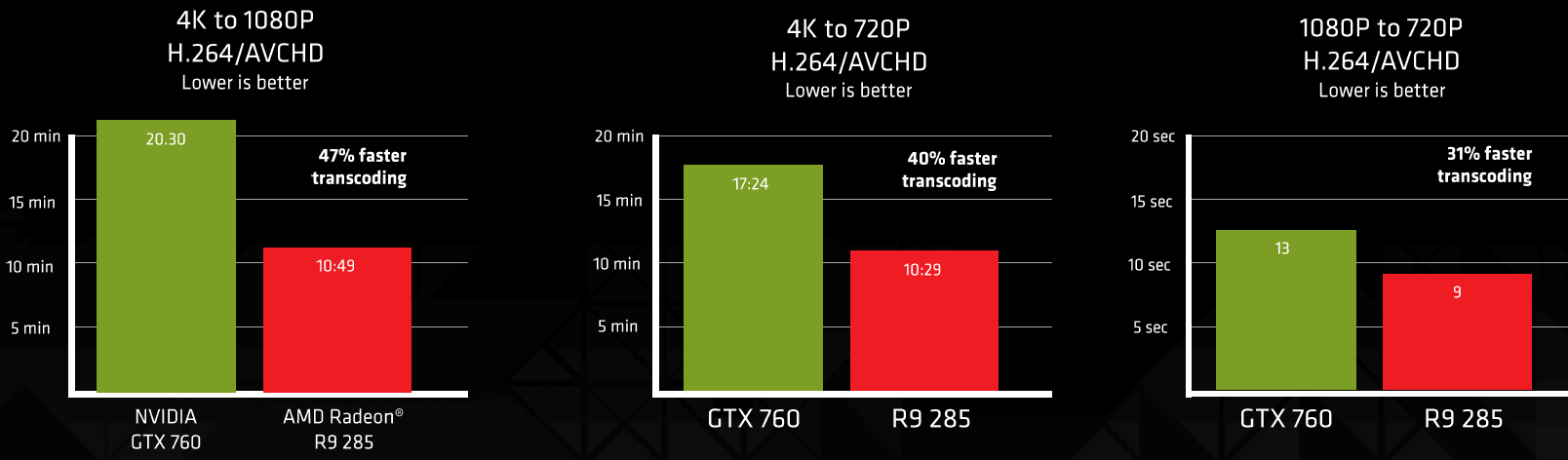 Также была значительно повышена производительность блока VCE — теперь он обеспечивает скорость кодирования до 12 раз быстрее реального времени для разрешения FullHD. Новый блок VCE поддерживает полностью аппаратное кодирование данных в формате H.264 профилей Baseline и Main, также поддерживается и UltraHD-разрешение. Компания AMD считает, что новинка обеспечивает лучшую в своём классе производительность кодирования формата H.264 по следующим данным внутренних тестов: