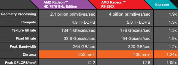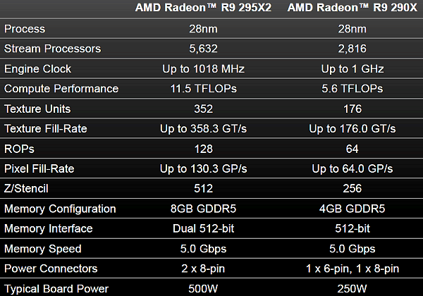 Для довольно достоверной оценки вероятной производительности двухчиповой новинки от AMD достаточно рассмотреть одни только теоретические показатели, по сравнению с одночиповой моделью Radeon R9 290X, так как в высоких разрешениях CrossFire обеспечивает близкую к 100% эффективность.