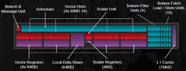Вычислительный блок архитектуры GCN включает различные функциональные блоки: модули текстурных выборок (16 штук), модули текстурной фильтрации (четыре штуки), блок предсказания ветвлений, планировщик, вычислительные блоки (четыре векторных и один скалярный), кэш-память первого уровня (16 КБ на вычислительный блок), память для векторных и скалярных регистров, а также разделяемая память (64 КБ на каждый Compute Unit).
