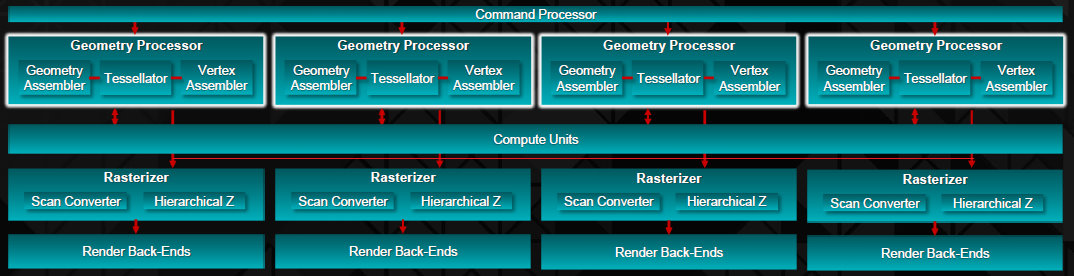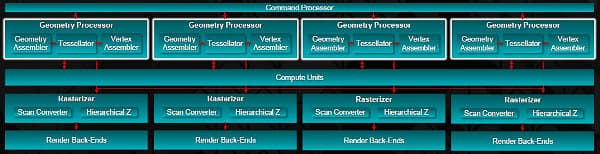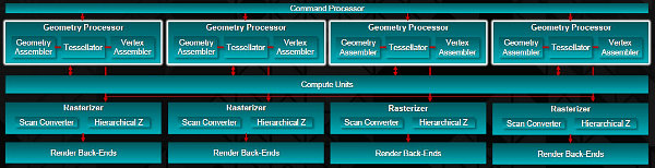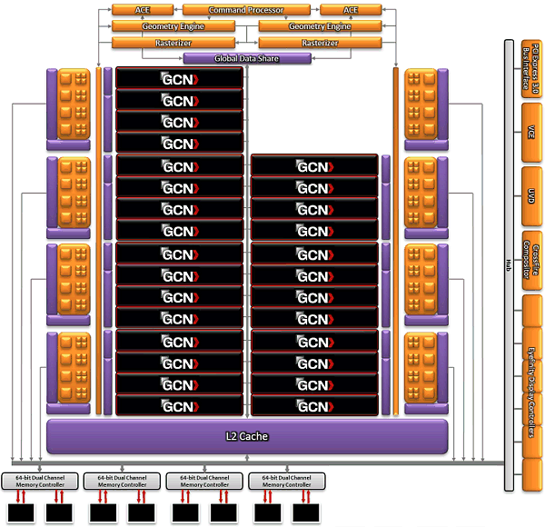 Новый графический процессор логически разделён на четыре части (Shader Engine), каждая из которых содержит по 11 укрупнённых вычислительных блоков (Compute Unit), включающих и текстурные модули, по одному геометрическому процессору и растеризатору, а также по несколько блоков ROP. Иными словами, блок-схема самого современного чипа AMD стала ещё больше похожа на схему чипов NVIDIA, также имеющих подобную организацию.