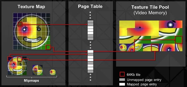 Новые возможности DirectX 11.2 включают тайловые ресурсы, которые используют аппаратные особенности Hawaii по огранизации виртуальной памяти GPU, называемые partially-resident textures (PRT). Используя виртуальную видеопамять, легко получить эффективную аппаратную поддержку алгоритмов, позволяющих применять в приложениях огромные объёмы текстур и их подкачку (streaming) в видеопамять. PRT позволяет повысить эффективность использования видеопамяти в таких задачах и подобные техники уже применяются в некоторых игровых движках.