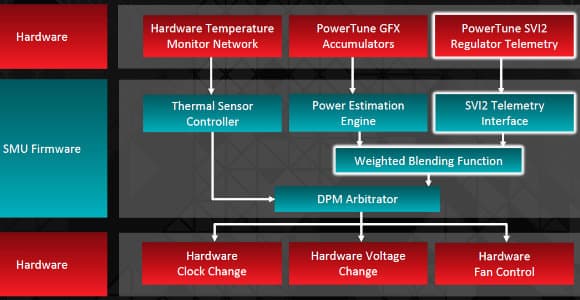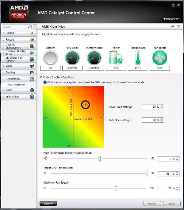 Кроме этого, PowerTune также обеспечивает и богатые возможности для разгона графического процессора Tonga. В настройках драйвера пользователь может установить несколько параметров, вроде целевой температуры GPU, относительной частоты вращения вентилятора в устройстве охлаждения, а также максимальный уровень энергопотребления, а всё остальное видеокарта сделает сама, установив максимально возможную частоту и другие параметры (напряжение GPU, частота вращения вентилятора) в изменившихся условиях.