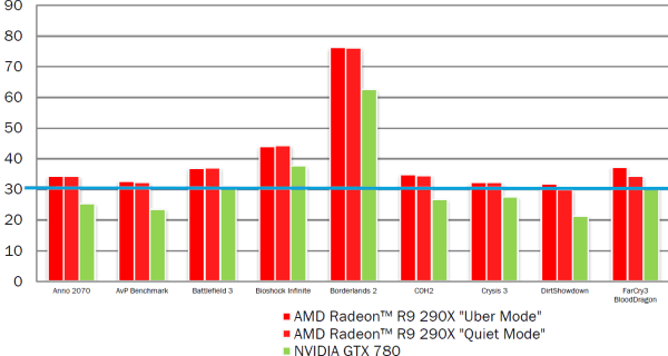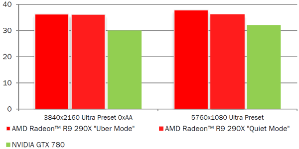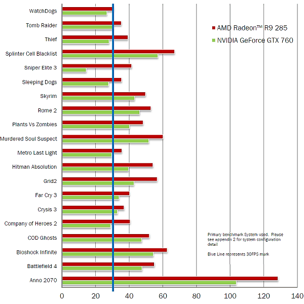 Использовалось разрешение 2560x1440 и такие игровые настройки, чтобы показать новинку с лучшей стороны частота кадров оставалась выше отметки в 30 FPS. В этом сравнении компании AMD их собственное решение Radeon R9 285 также обеспечивает большую производительность, по сравнению с конкурентом, причём сразу во всём наборе приложений.