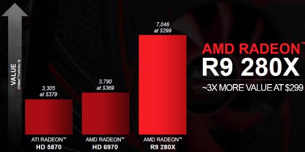 Цифры бенчмарка показывают позиционирование Radeon R9 285 на рынке относительно других решений. В этом конкретном бенчмарке, по измерениям компании AMD, скорость новой видеокарты Radeon R9 285 оказалась чуть выше производительности Radeon R9 280, что можно объяснить работой GPU на более высокой реальной частоте. Ну и конкурент от NVIDIA по цене явно проигрывает новой плате, уступая ей по скорости рендеринга примерно на четверть.