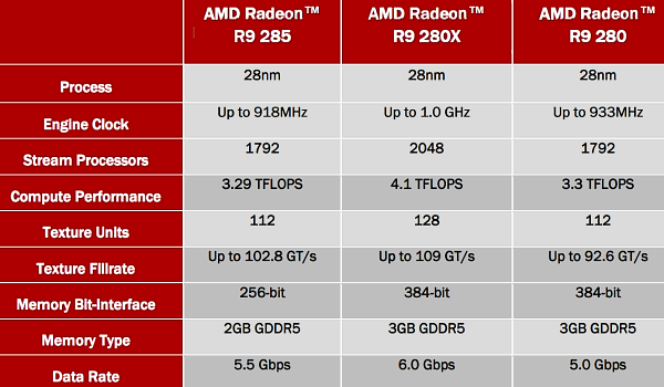 | Radeon R9 285 | «Tonga» | 1792/112/32 | 918 | 1375(5500) | 2 GDDR5 | 176 (256) | 102,8 | 29,8 | 190 |