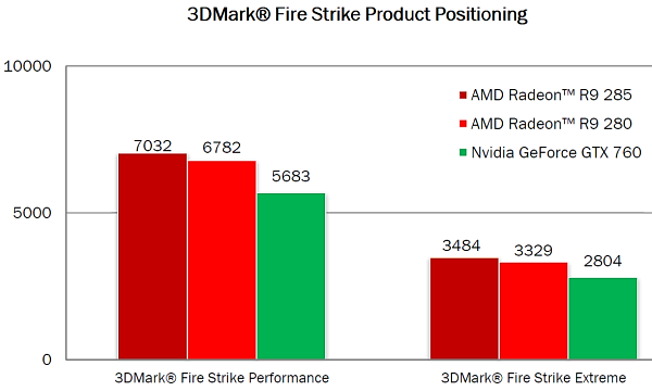 В линейке новинка расположилась между R9 270X и R9 280X — полноценными моделями на базе чипов Tahiti и Pitcairn, да и по скорости она где-то между этими моделями, несмотря на больший цифровой индекс, чем у R9 280X. Судя по теории, Radeon R9 285 должна по производительности быть очень близка к модели Radeon R9 280, да и совсем старой уже Radeon HD 7950 Boost. Рекомендованная цена на Radeon R9 285 на момент анонса соответствовала ценам замещаемой модели AMD и аналогичного решения конкурента из этого же ценового сегмента — GeForce GTX 760, который и является главным соперником для новой модели.