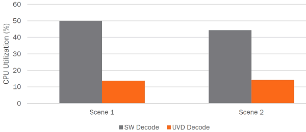 Чтобы снизить нагрузку на CPU, в состав графического процессора Tonga, на базе которого основана модель Radeon R9 285, включили переработанный блок декодирования UVD с поддержкой полного аппаратного декодирования данных формата H.264 High Profile Level 5.2 в разрешениях до 4K включительно, что даёт значительное снижение ресурсоёмкости при декодировании и проигрывании подобных видеороликов, по сравнению с чисто программным методом:
