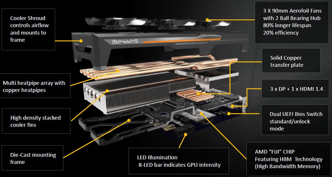Один из самых спорных моментов в характеристиках новой модели — наличие лишь 4 ГБ видеопамяти, чего пока что хватает даже для высоких разрешений при максимальных настройках качества, но в ряде современных игр при 4K-разрешении рендеринга, а также включении полноэкранного сглаживания и высоких настройках качества, уже сейчас требуется еще больший объем. И AMD была бы рада предложить вариант с 8 ГБ, но увы — первое поколение HBM-памяти просто не позволяет сделать его. Подробнее обо всех тонкостях, связанных с HBM-памятью, читайте ниже.