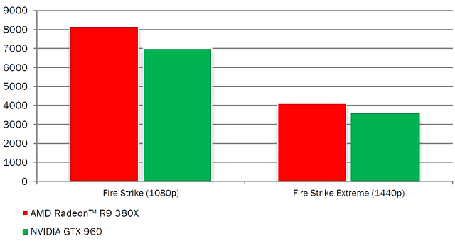 Позиционирование Radeon R9 380X в линейке графических решений компании AMD очень простое — новинка расположилась между моделями R9 380 и R9 390 и по производительности, и по цене. Что касается конкурента от Nvidia, то Radeon R9 380X не имеет прямого соперника по цене, а находится между двумя моделями GeForce: GTX 960 и GTX 970, но чуть ближе к первой. Сравнивать выгоднее с GTX 960, особенно в 3DMark Fire Strike, что AMD и делает: