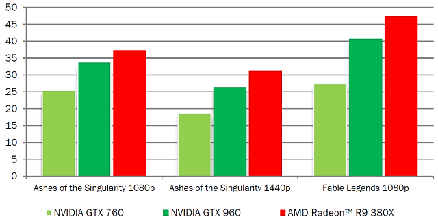 Хорошо видно, что за счёт преимущества в производительности и некоторых архитектурных решений (в том числе асинхронного выполнения шейдеров различных типов: пиксельных и вычислительных, к примеру), представленная на прошлой неделе видеокарта Radeon R9 380X опережает как старую уже GeForce GTX 760, так и вполне актуальную модель GTX 960, стоящую чуть меньше, правда.