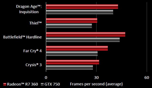 Достаточно высокая производительность в этих играх крайне важна для игроков, и по показателям Radeon R7 360 видно, что вся линейка видеокарт компании AMD обеспечивает в таких приложениях достаточную скорость смены кадров. Даже недорогие модели Radeon R7 360 и R7 370 способны на высокую частоту кадров, превышающую 60 FPS в самых популярных онлайн-играх.