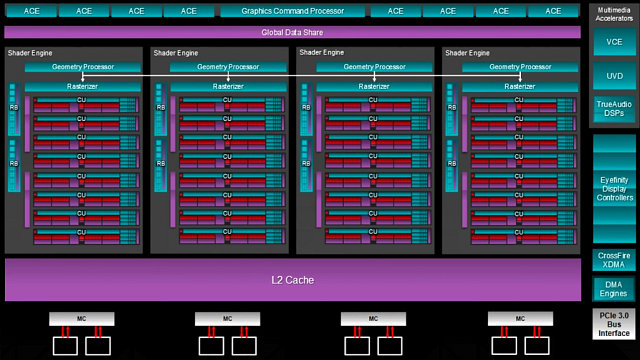 По сравнению с Hawaii, в плане организации инженеры компании AMD в чипе Fiji не тронули ничего, просто разместив большее количество вычислительных блоков Compute Unit в каждом движке Shader Engine (16 вместо 11), но оставили без изменений количество самих движков (вероятно, это — архитектурное ограничение GCN в ее нынешнем виде) и количество других исполнительных блоков в их составе.
