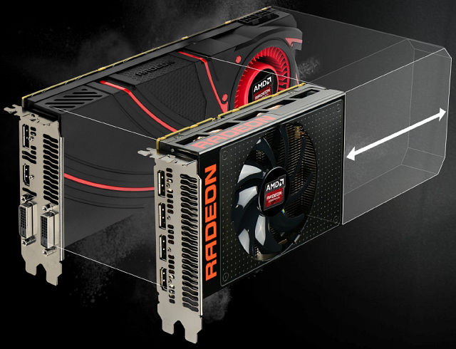 Сама по себе видеокарта очень компактна по размерам — длина печатной платы Radeon R9 Fury X равна всего лишь 7.5 дюймов (около 190 мм), что значительно меньше типичных референсных карт верхнего ценового диапазона. Небольшая плата сочетается с большим радиатором системы водяного охлаждения. Сочетание СВО с HBM-памятью позволило уменьшить физические размеры и число компонентов на плате (в схеме питания, в частности). Можно сравнить площади GPU и RAM на Radeon R9 290X и R9 Fury X: