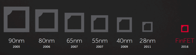 Архитектура Polaris изначально разрабатывалась под возможности FinFET-техпроцессов, и должна использовать все их возможности. Если описывать вкратце, то FinFET-транзистор — это транзистор с каналом, окруженным затвором через прослойку в виде изолятора с трех сторон — по сравнению с планарным, где поверхность сопряжения — это одна плоскость. FinFET-транзисторы имеют более сложное устройство, и трудностей при реализации новой технологии было предостаточно, для освоения соответствующих техпроцессов потребовалось пять лет.