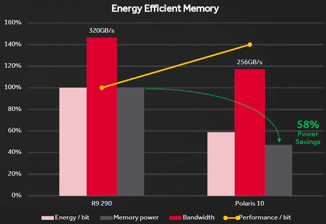Если сравнивать Radeon RX 480 с Radeon R9 290, то новое решение потребляет заметно меньше энергии для обеспечения той же эффективной пропускной способности, по сравнению с видеокартой предыдущего поколения. В результате, у новинки заметно выше и производительность в пересчете на бит — хотя у Radeon R9 290 выше пиковая ПСП, но она куда энергоэффективнее используется в Polaris 10 — общее потребление энергии интерфейсом памяти составляет 58% от потребления старого GPU.