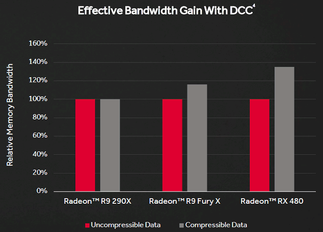 Внутричиповое сжатие данных увеличивает общую эффективность работы, обеспечивает более полное использование шины данных и сказывается на энергоэффективности. В частности, если в Radeon R9 290X внутреннего сжатия информации не было и эффективная ПСП равна его физической ПСП, то в случае решения на чипе Fiji сжатие позволило сэкономить почти 20% ПСП, а в случае Polaris и до 35-40%.