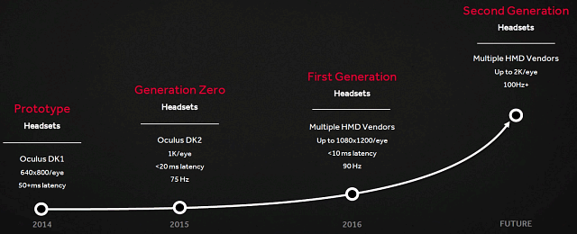 Компания AMD также со своей стороны занимается улучшением характеристик, связанных с VR. Так, технология LiquidVR предполагает реализацию некоторых возможностей, улучшающих VR на решениях компании. В числе последних изменений поддержка аудиотехнологии TrueAudio Next, резервирование вычислительных блоков под конкретные задачи, технология асинхронных вычислений Quick Response Queue, переменное разрешение и качество рендеринга для VR, поддержка DirectX 12 и Vulkan.