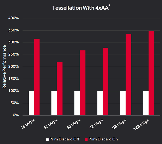 Ускоритель отбрасывания геометрических примитивов помогает увеличить скорость обработки геометрии, особенно в задачах вроде тесселяции с мультисэмплингом. На диаграмме видно, что в разных условиях новый блок позволяет увеличить производительность до трех раз. Впрочем, это синтетические данные заинтересованной стороны, лучше смотреть по игровым результатам независимых тестов.