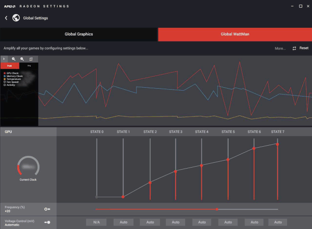 Radeon WattMan — это новая утилита AMD для разгона, позволяющая изменять напряжение GPU, частоту графического процессора и видеопамяти, скорость вращения вентилятора системы охлаждения и целевую температуру. Radeon WattMan основан на возможностях, виденных ранее в Radeon Software, но предлагает несколько новых функций по тонкому разгону — с иными возможностями по управлению напряжением и частотой GPU. Также в WattMan появился удобный мониторинг активности GPU, тактовых частот, температур и скорости вентилятора.