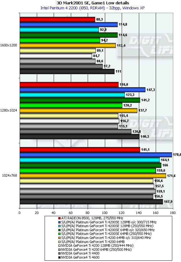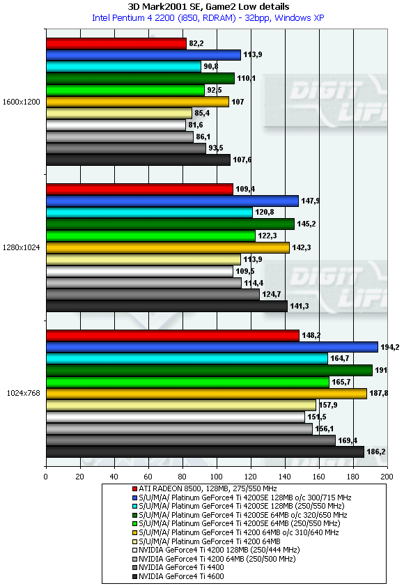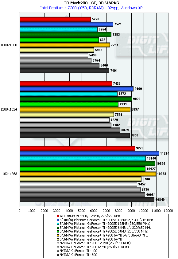 Отмечу, что для сравнения с рассматриваемыми картами специально была взята карта на базе RADEON 8500 со 128-ю мегабайтами, как самая дорогая ныне из всех существующих на этом графическом процессоре. Ее стоимость значительно превышает цену на самую дорогую карту из Ti 4200 от S/U/M/A/.