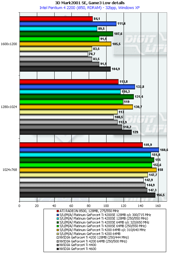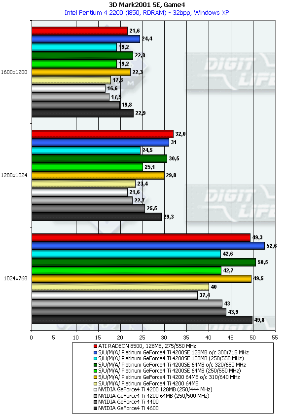 Этот тест является коронным для RADEON 8500, поэтому только Ti 4600 способна тут побороться с ним. Другие комментарии излишни.