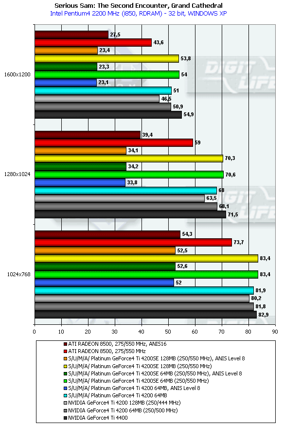 - Serious Sam: The Second Encounter v.1.05 (Croteam/GodGames) — OpenGL, мультитекстурирование, Grand Cathedral demo, настройки тестирования: quality, S3TC OFF, Trilinear