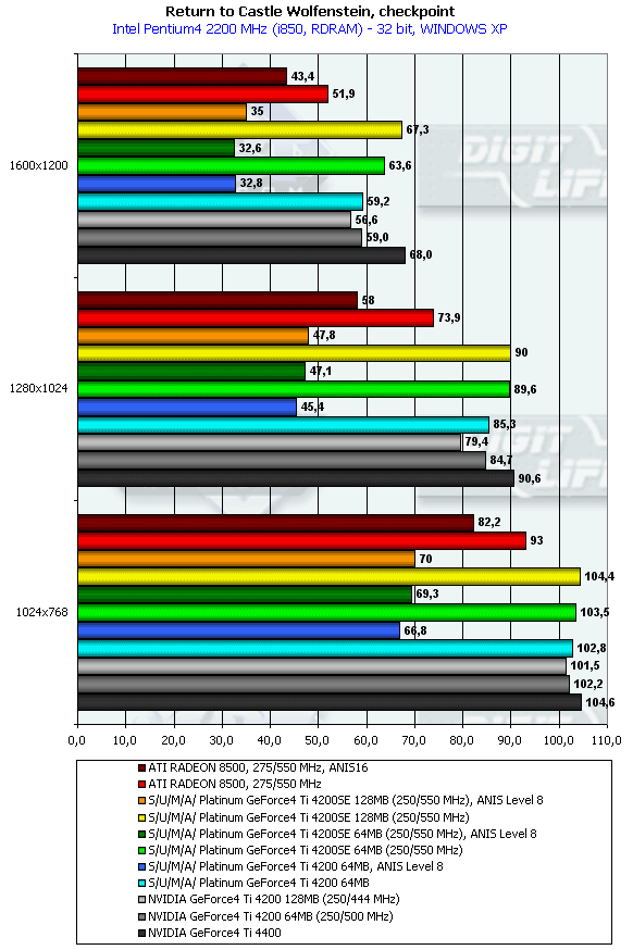 - Return to Castle Wolfenstein (MultiPlayer) (id Software/Activision) — OpenGL, мультитекстурирование, Checkpoint-demo, настройки тестирования — все на максимально возможном уровне, S3TC OFF, конфигурации можно скачать тут;
