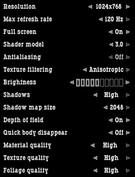 Quick body disappear (Off/On) — параметр включает специальный режим, в котором мертвые тела врагов исчезают из сцены быстрее, чем обычно. Это помогает добиться более высокой производительности в сценах с большим количеством персонажей. В отключенном режиме трупы также исчезают, но по происшествию большего времени. На производительности это может сказываться, так как чем больше моделей персонажей выводится на экране, тем ниже скорость рендеринга.