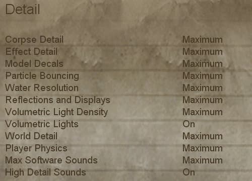 Corpse Detail (Minimum/Medium/Maximum) — настройка, определяющая количество вражеских трупов на уровне, она изменяет время их исчезновения. Например, на минимальной установке тела уничтоженных врагов исчезают сразу после их падения на землю. Понижать настройку в данной игре почти не имеет смысла, так как количество врагов в ней жестко ограничено, с трудом вспоминаются места с более чем 3-4 врагами в одной комнате. На тестовой системе особой разницы в производительности, по большому счету, не обнаружено.